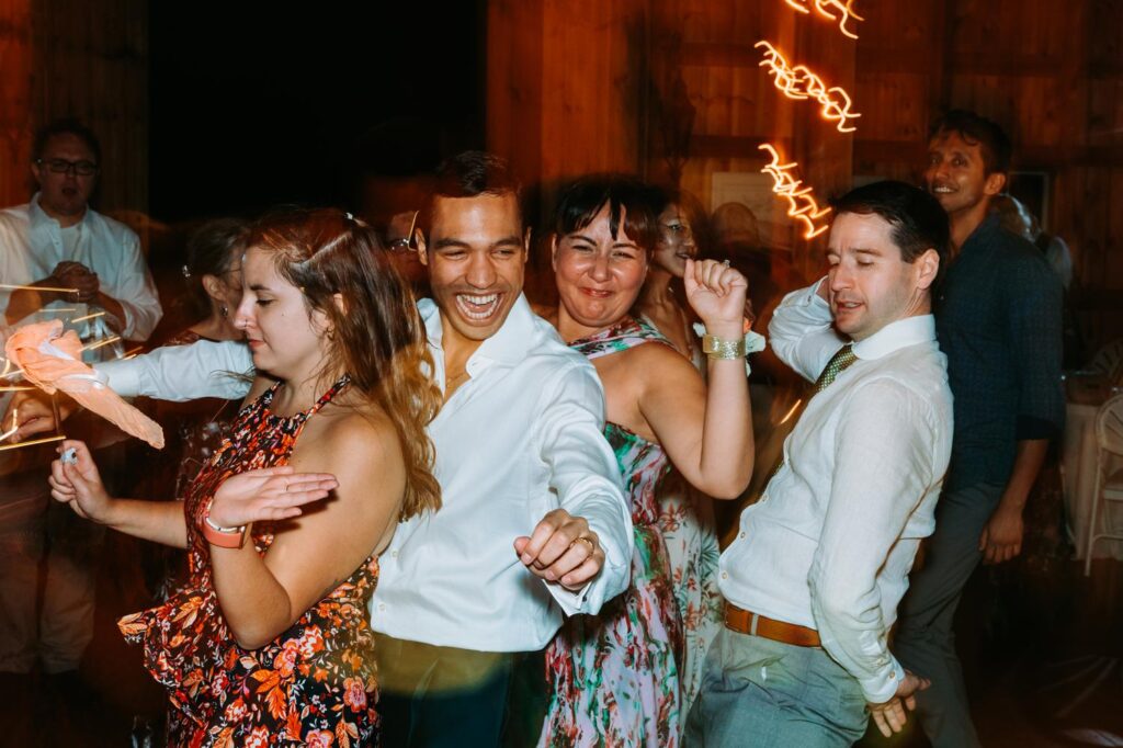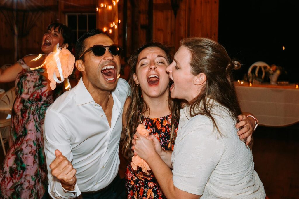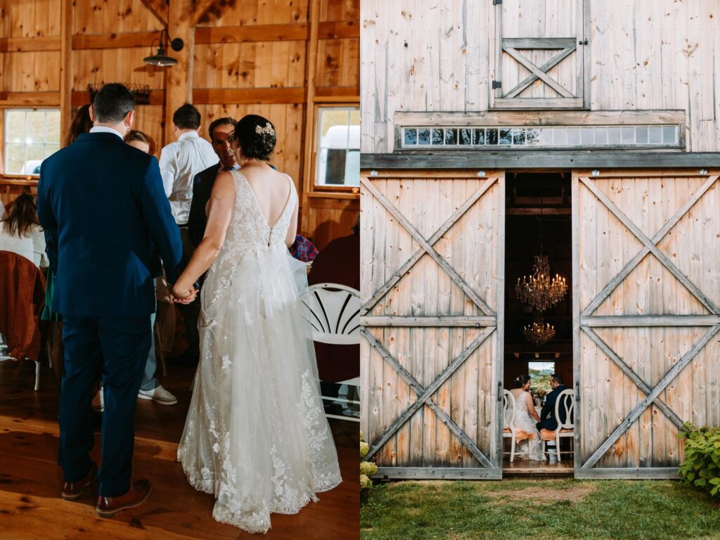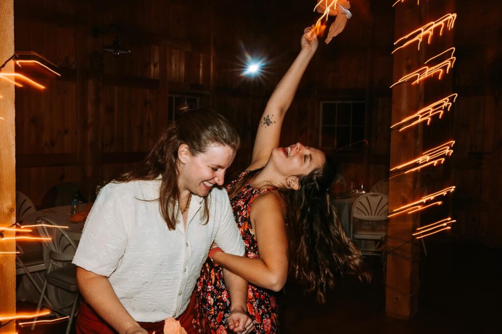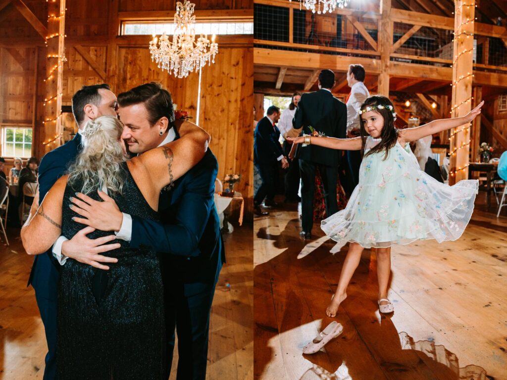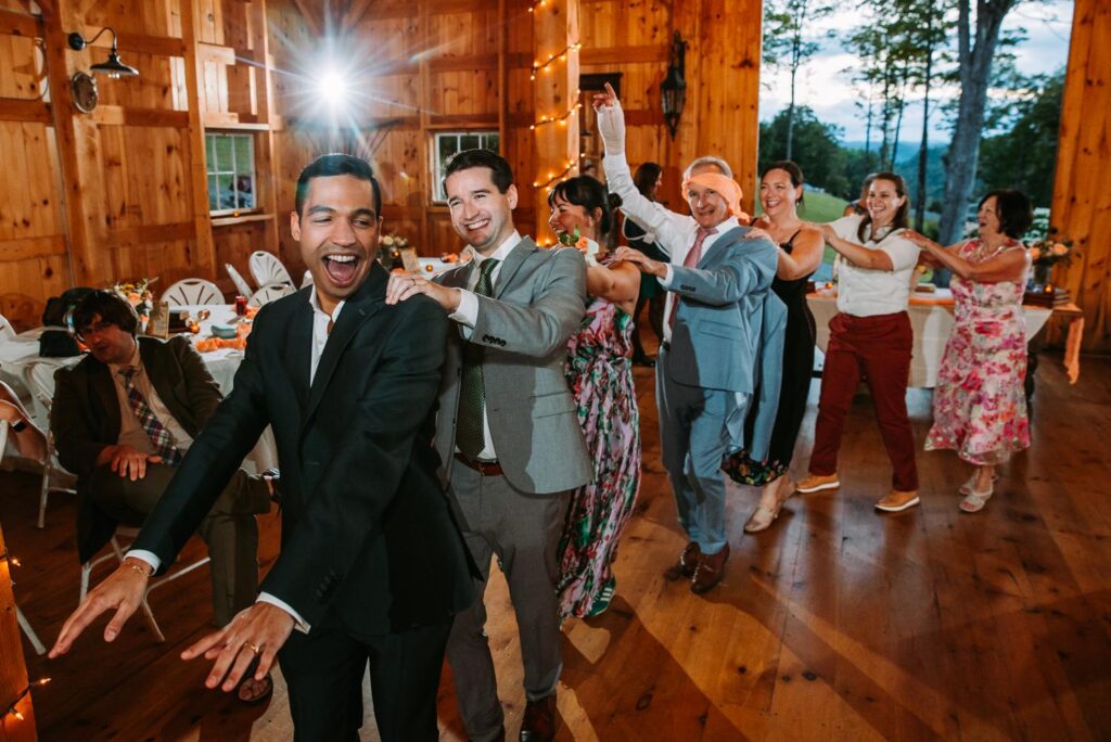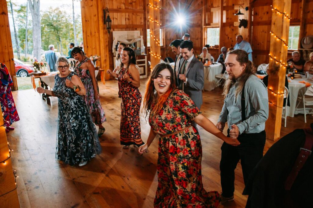 The ceremony was held outside with the White River Valley spread out behind them and mountains in the distance. Inside, the barn was gorgeous: hanging chandeliers, warm light, and a dance floor that got serious FAST. Their first dance was to “Long Lost” by Lord Huron. If you haven’t heard it, go listen and then imagine dancing to it in a candlelit Vermont barn with mountains outside. Yeah. I could live that moment on repeat.