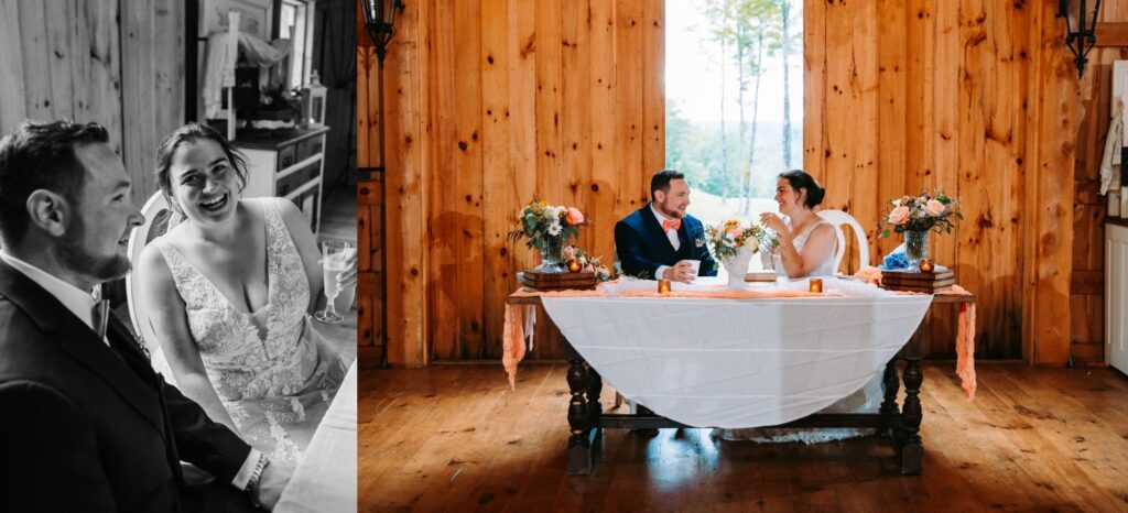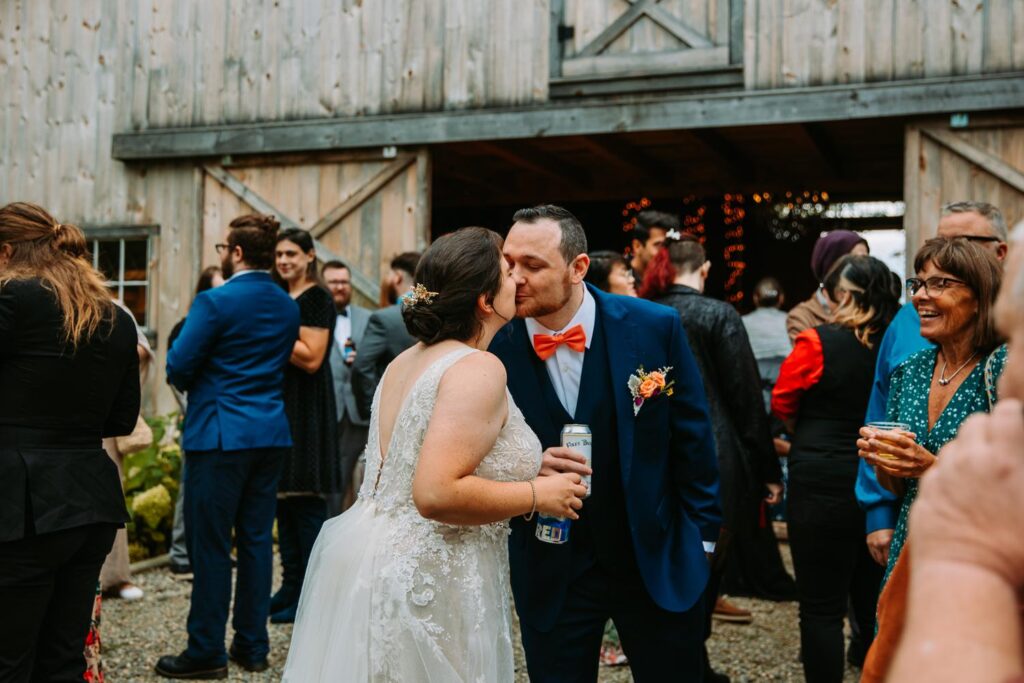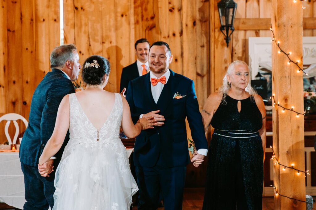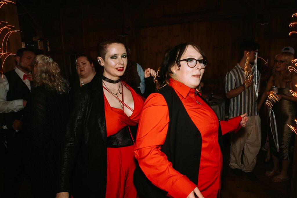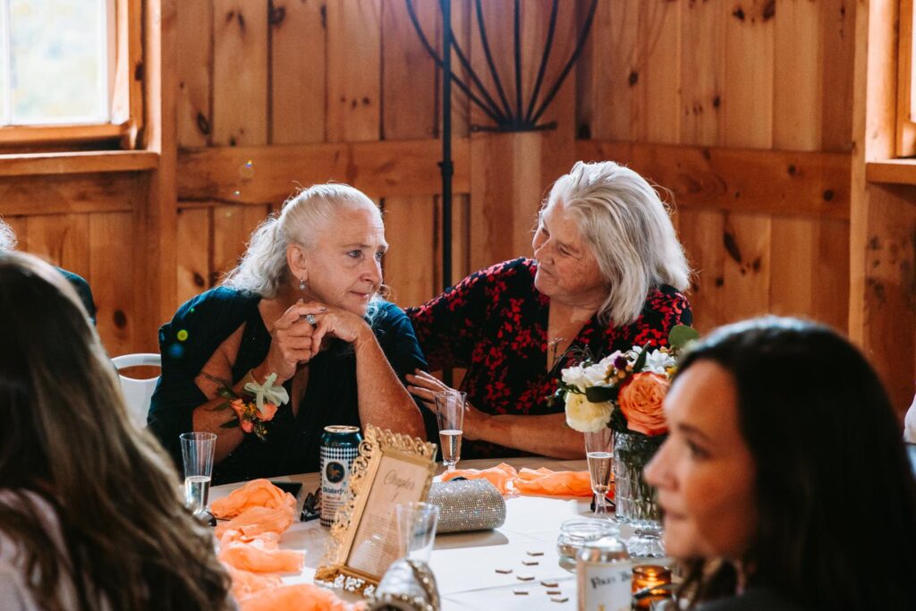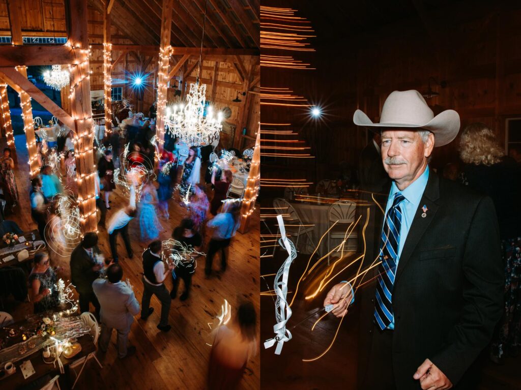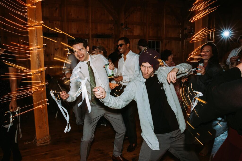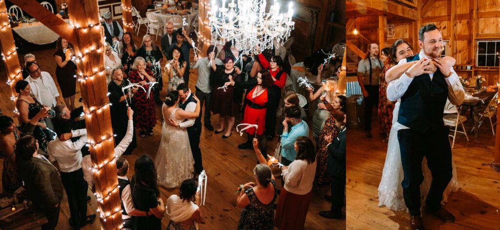 The ceremony was held outside with the White River Valley spread out behind them and mountains in the distance. Inside, the barn was gorgeous: hanging chandeliers, warm light, and a dance floor that got serious FAST. Their first dance was to “Long Lost” by Lord Huron. If you haven’t heard it, go listen and then imagine dancing to it in a candlelit Vermont barn with mountains outside. Yeah. I could live that moment on repeat.