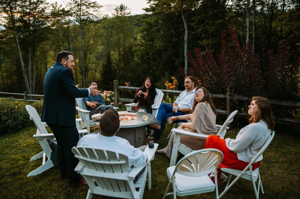 Q: What is The Barn on Gobeille Farm like as a wedding venue? It’s a working farm with a restored barn, on-site cottages for getting ready, and outdoor ceremony space with mountain views. The vibe is relaxed and natural. Guests can wander the grounds, play lawn games, sit by the firepit, and actually enjoy themselves rather than being stuck at a table all night. The barn interior has gorgeous hanging chandeliers and plenty of warmth for an evening reception.