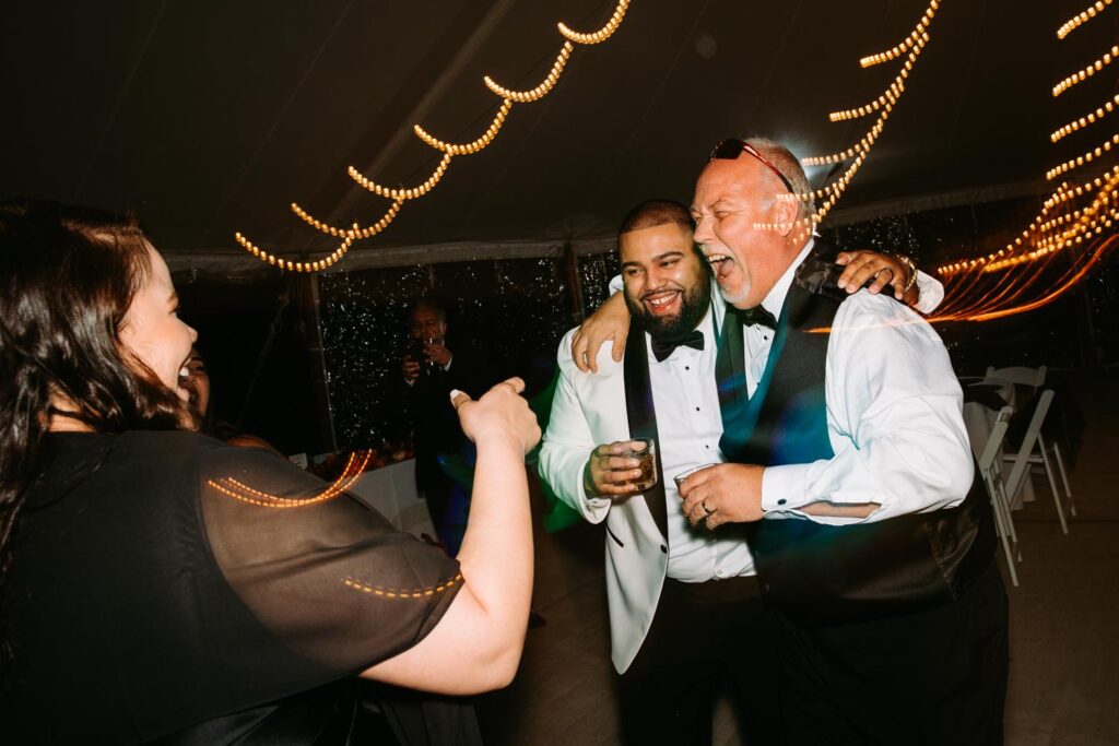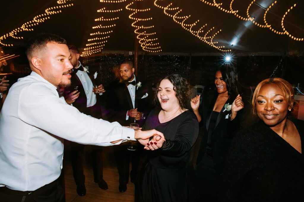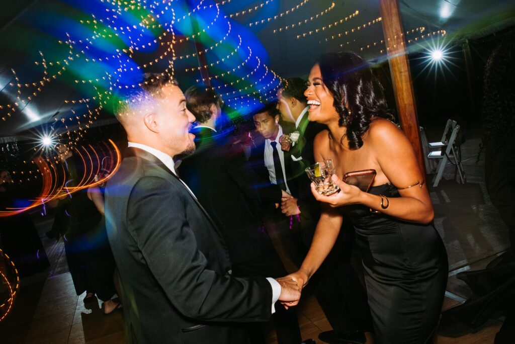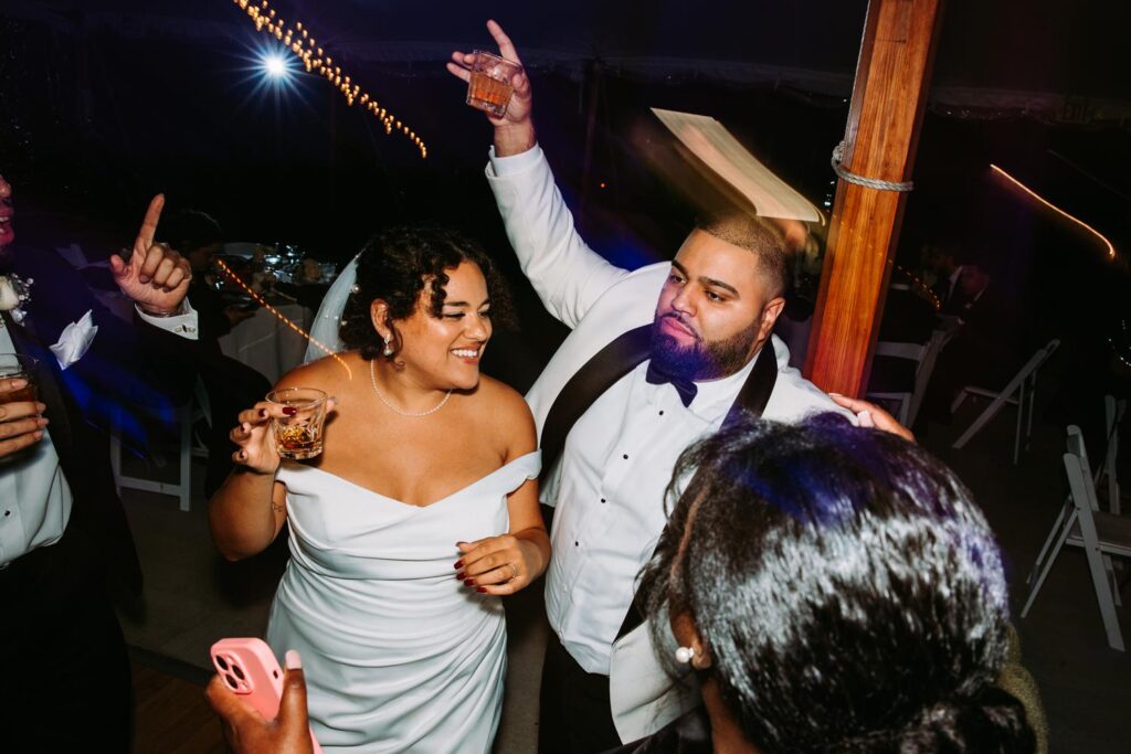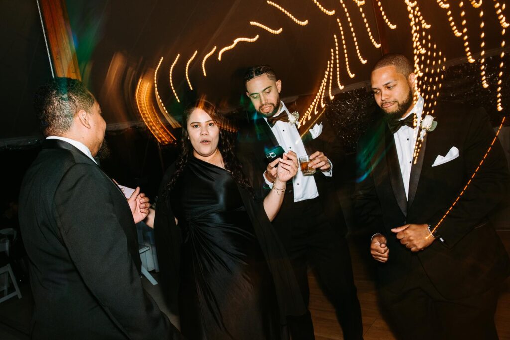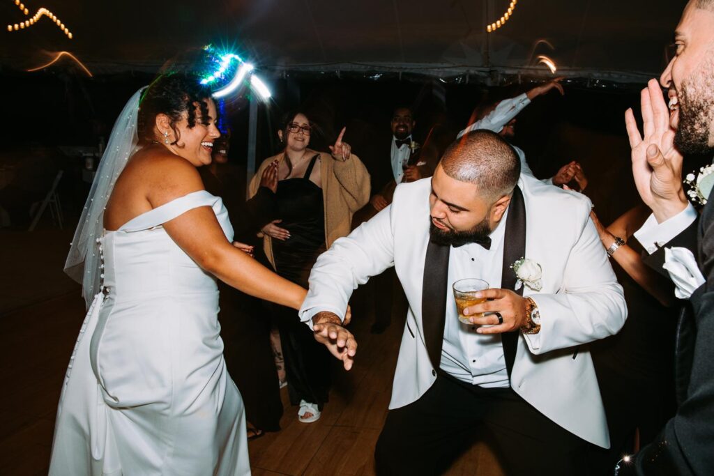 The reception felt relaxed but full of life. The energy moved fast in the best way. Guests danced under the tent, grabbed drinks at the bar, wandered outside to talk, then circled right back to the dance floor.
