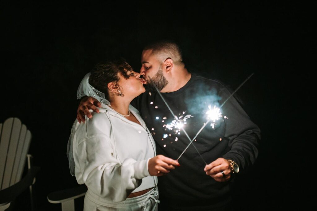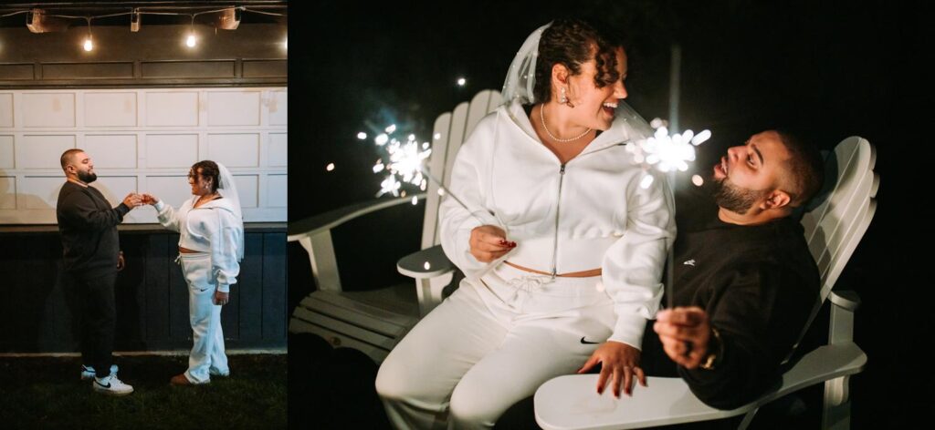 The dress code was black, and it looked incredible against the colorful fall backdrop. At the end of the night, Kaitlyn and David changed into matching two-piece sweatsuits for their sparkler exit. Kaitlyn in white, David in black. Comfortable, confident, and very them.