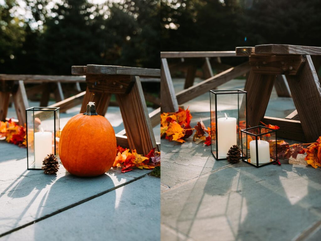The ceremony took place outdoors, tucked into the trees at The Garden at The Hops Company. Colorful leaves, pumpkins, and lanterns lined the space, and the early October sun filtered through the trees in a way that made everything glow. Especially Kaitlyn, who had the light shine on her face for the whole ceremony. Totally ethereal.