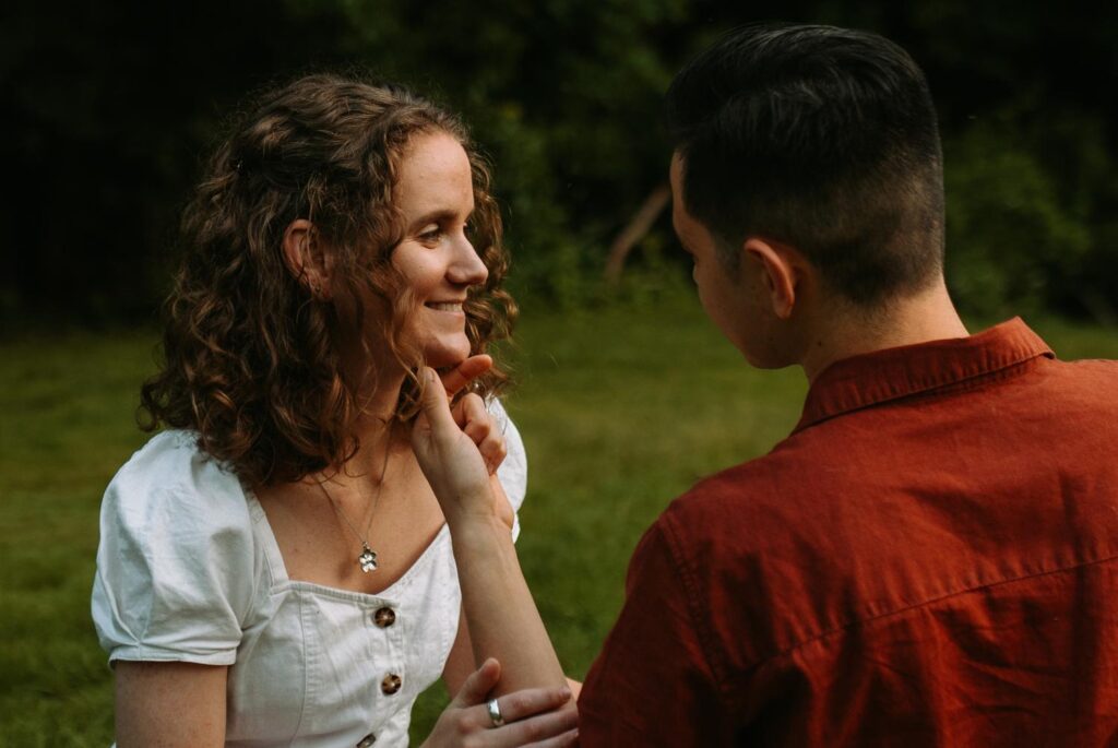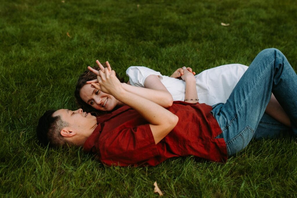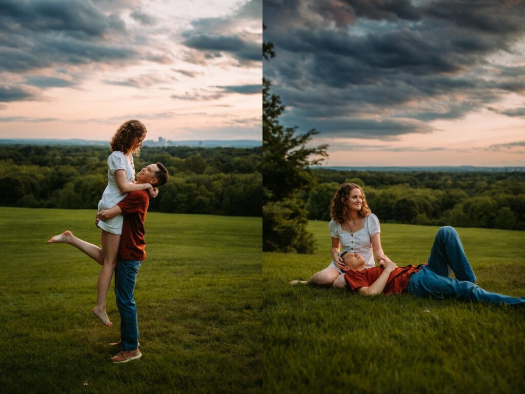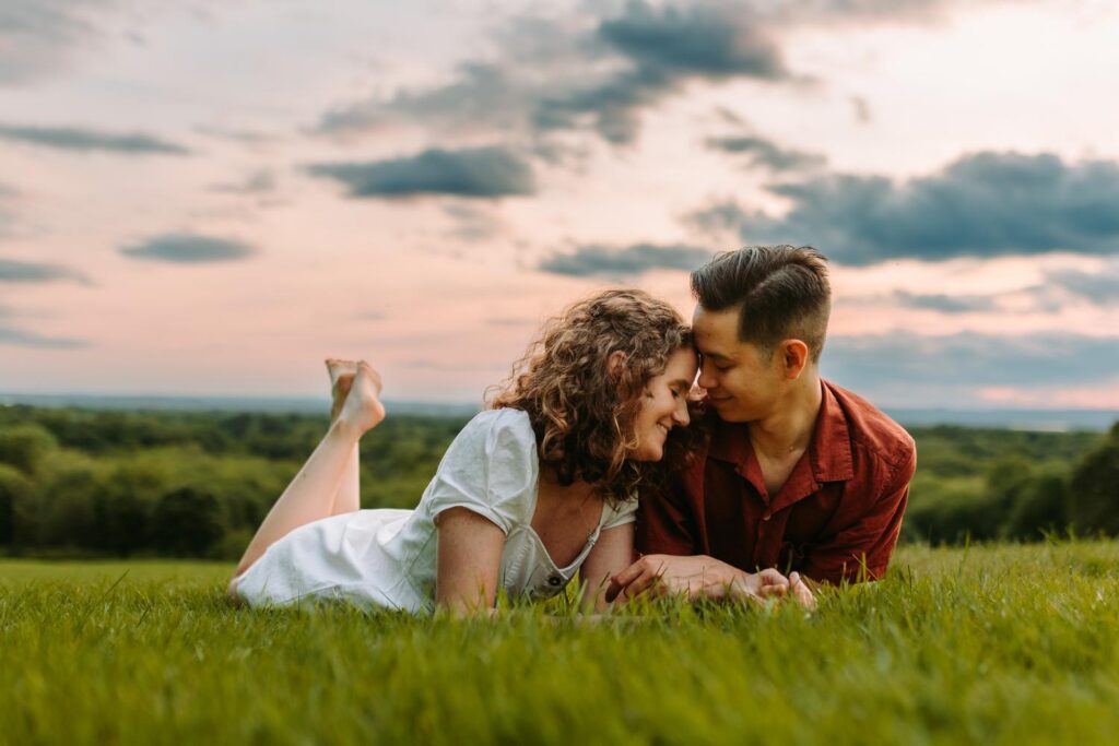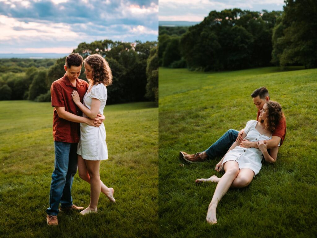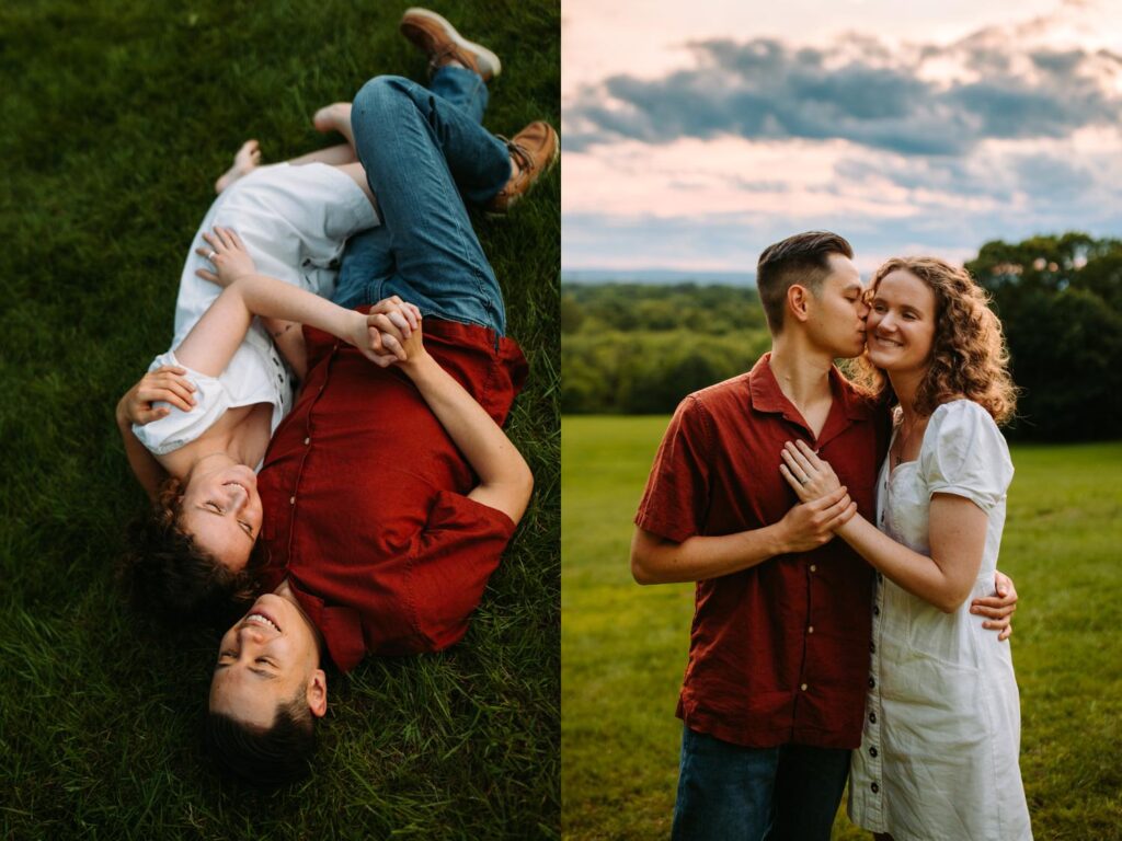 This was a true summer engagement session. Sweat, bugs, warm air, and that hazy glow that only exists on lazy summer evenings. And instead of fighting it, Madeline and Austin leaned in completely. They danced barefoot through the field, lay in the grass together, and laughed while swatting bugs away.
